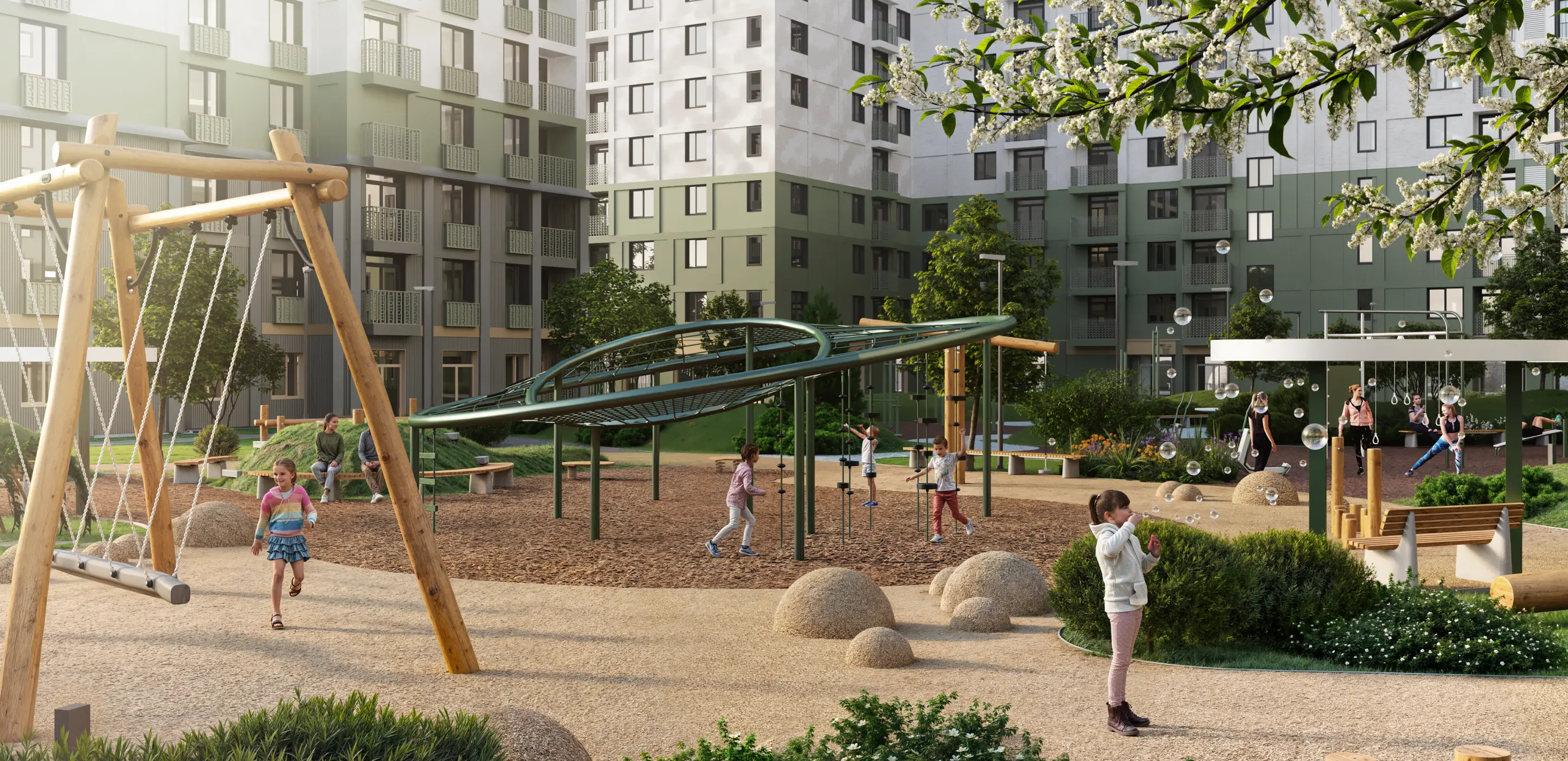 Детские сады и школы, мед. учреждения, торговые центры, фитнес-клубы и парки для отдыха.